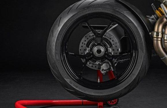 Zadní stojan pro motocykl s jednostrannou kyvnou vidlicí.
